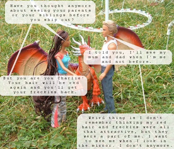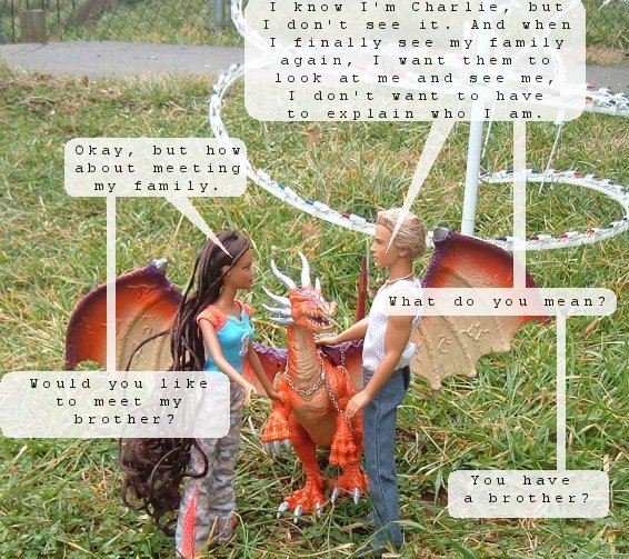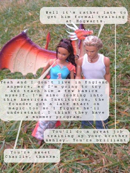 The journey that started for the Weasley's that day had started for Charlie Weasley months ago. "Charlie" had arrived on Christmas in a box that said Cali Guy Blaine, but he'd come out the box knowing he was Charlie Weasley and had never been called anything else. He'd immediatly taken to taking care of a local adolecent Dragon named Sango.