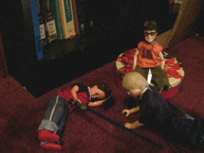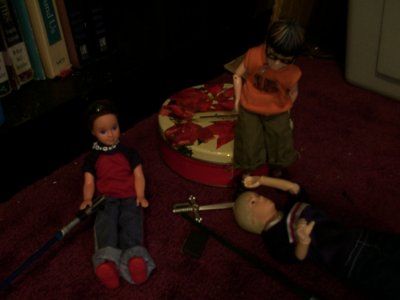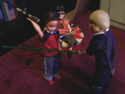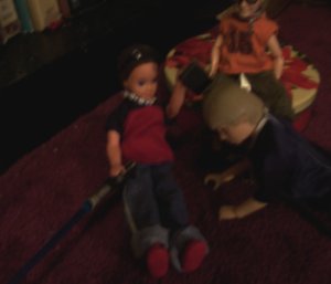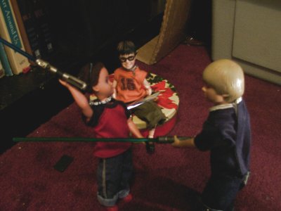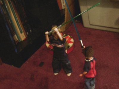 (Anakin, Todd, and Harry were up early one morning, playing around. Anakin had ‘borrowed’ a couple of lightsabers from the Star Wars figures and the boys were taking turns with them.)