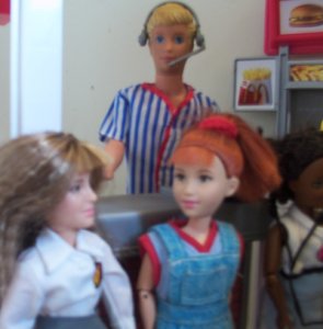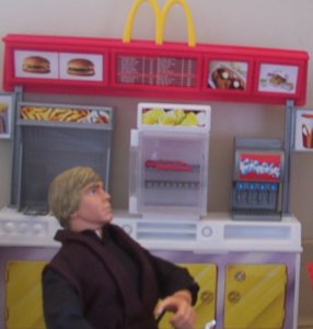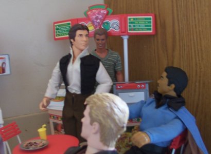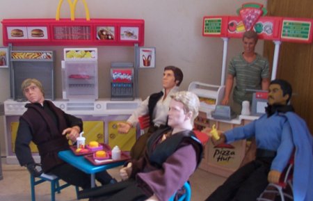 (She found the best pilots in the action figure collection eating fast food and talking about Star Ships. They were all Star Wars figures, Anakin Skywalker-the big one, Luke Skywalker, Lando Calrissian, and Han Solo.)