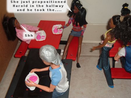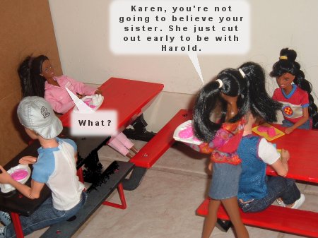 (Lina headed to lunch after. It was early in the lunch period, so people were still coming in and getting in the lunch line. Lina rushed over to Karen as soon as she spotted her.)
